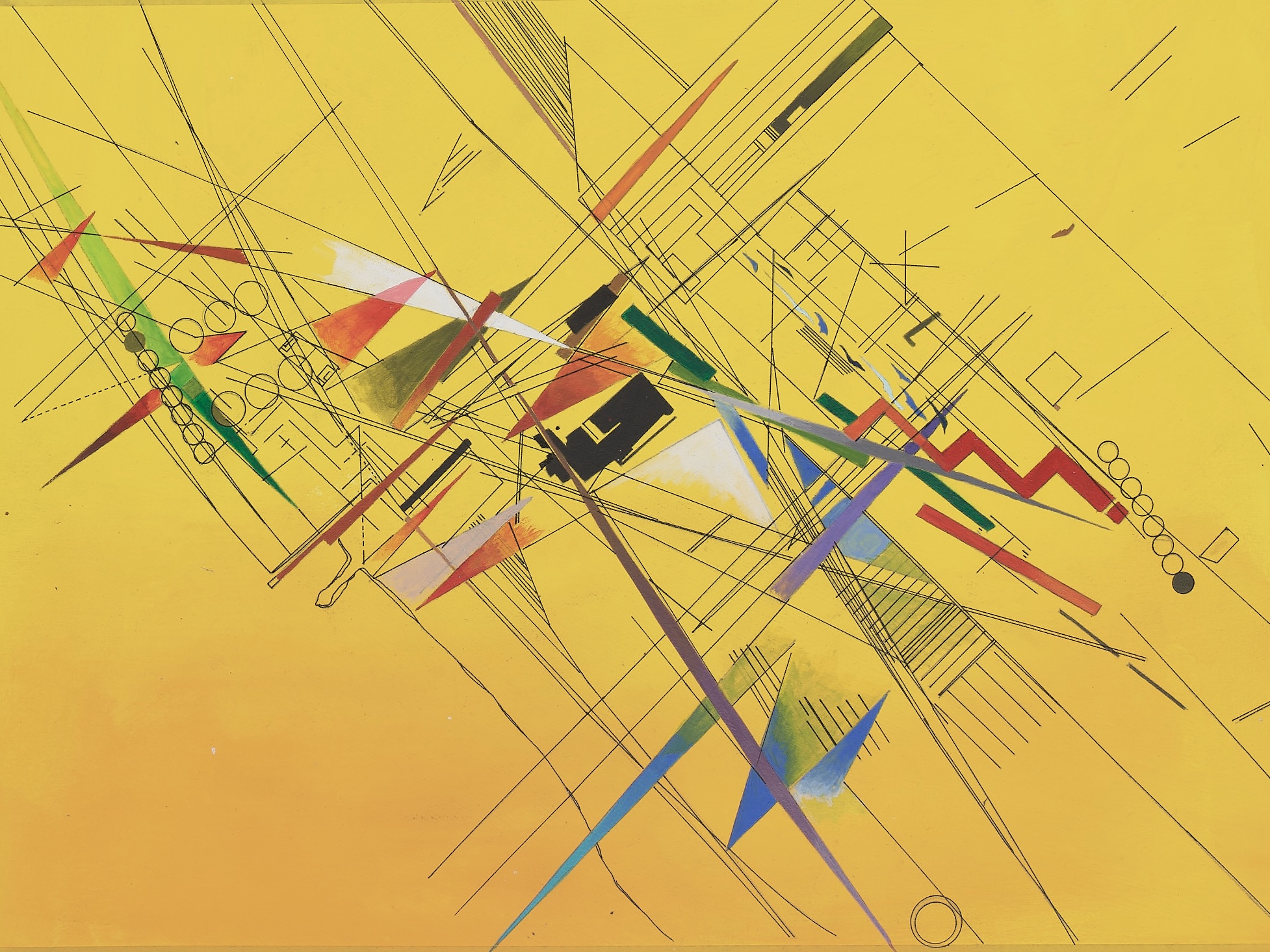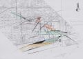 Hadid’s proposal embraced a fragmented reinterpretation of Cerdà’s grid, introducing interlocking, skewed geometries that twisted and distorted the city’s established axis. The accompanying painting illustrates Hadid’s method of deconstructing the site. It envisioned the Diagonal as an ‘elastic corridor,’ traversing and adapting to varying local conditions, such as irregular village zones, gridded housing areas, and railway and waterfront strips. Abstracted urban elements float dynamically, tracing their trails in intersecting colour gradations and dashed pathways—projecting a transient, vibrant and interconnected metropolitan environment. The resulting scheme was intended to encourage street-level activity, increasing social interaction.