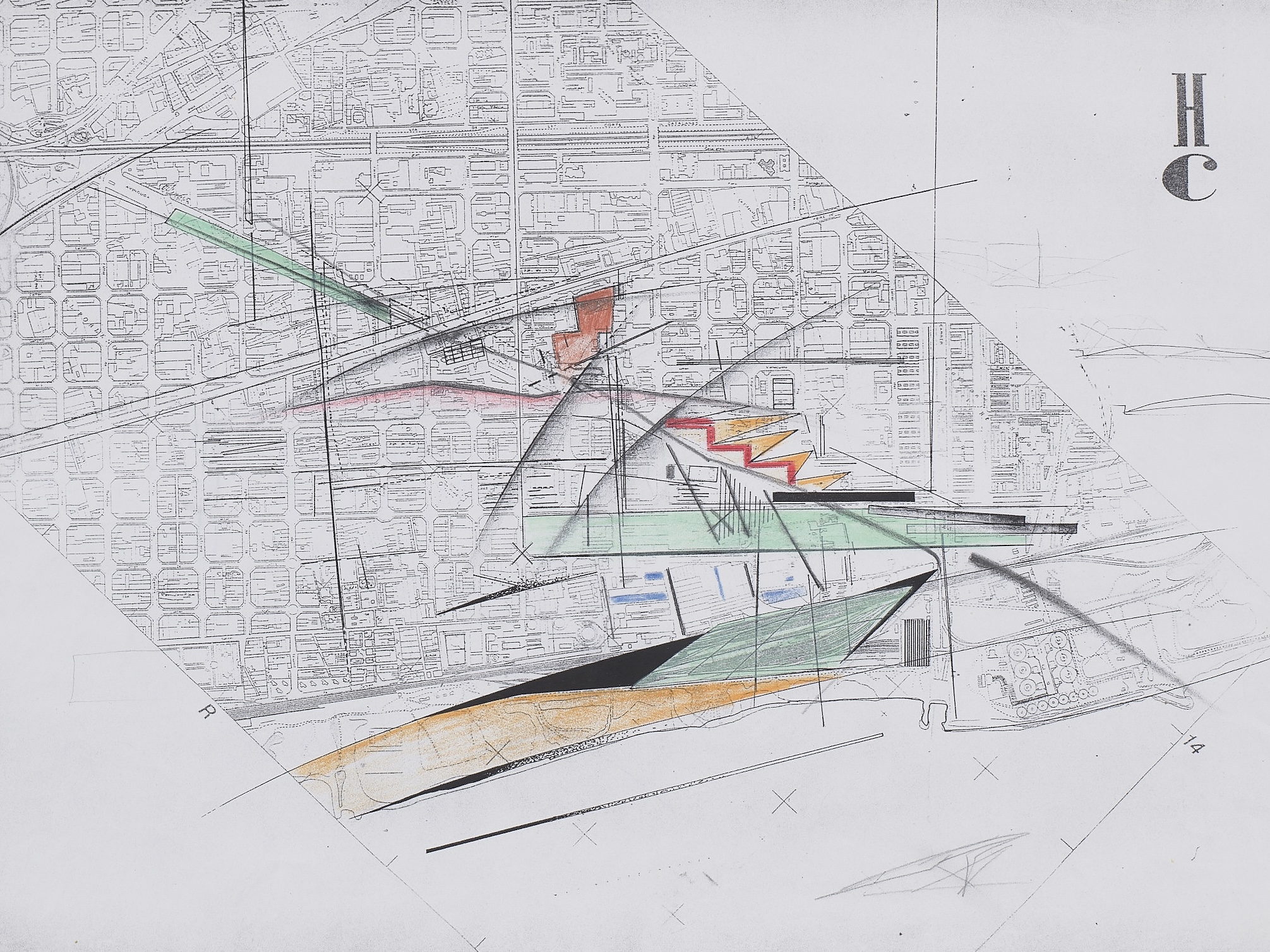 Hadid’s design transcended conventional housing paradigms, injecting dynamism and complexity into the entire city. A similar approach had emerged two years earlier, in New York, Manhattan: A New Calligraphy of the Plan (1987) where the American grid is reconfigured through charged insertions. Both projects share a strategic interest in spatial disruption, exploded geometries and layered fields towards ‘a new’ metropolitan way of living.